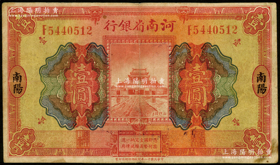 民国十二年(1923年)河南省银行开封龙亭图壹圆,南阳地名,罕见,原票七五成新