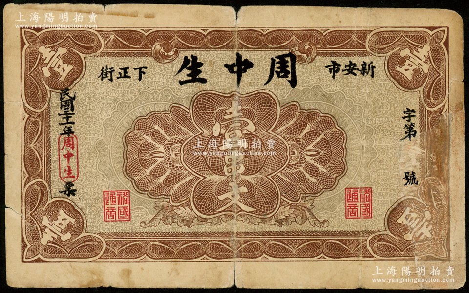 民国二十一年(1932年)周中生(杂粮行)壹串文,“新安市下正街”地名,属河南新安县民间钞票,少见,有修补,七成新