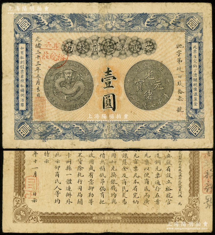 光绪三十三年(1907年)安徽裕皖官钱局壹圆,加盖“驻六裕皖庄”地名圆戳,背面告示文字尚清晰;源于前辈名家之遗藏,原票七五成新