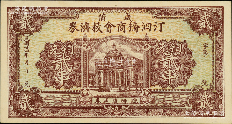 民国廿四年(1935年)咸蒲汀泗桥商会救济券铜元贰串,上印武汉市政府大楼,背印汀泗桥全市之风景图;源于德国名家白尔文先生之旧藏,少见,九五成新