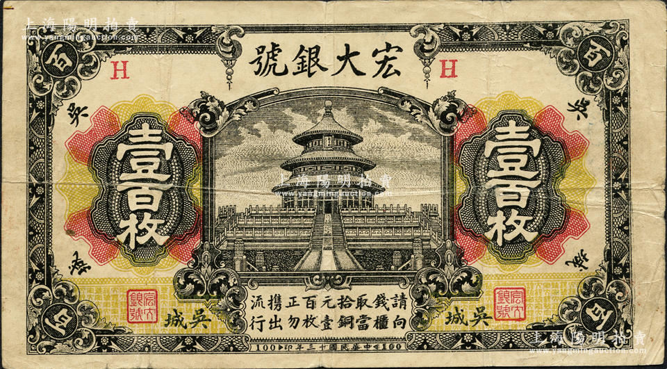 民国十三年(1924年)宏大银号壹百枚,乃江西“四大名镇”吴城镇(时属新建县,今归永修县辖)之钱庄钞票,上印北京天坛图,背印北海白塔图;源于日本名家森本勇先生之旧藏,少见,近八成新