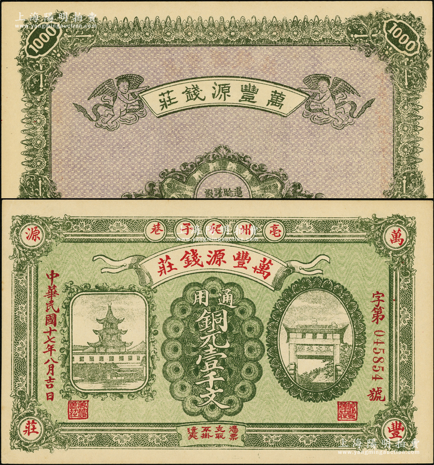 民国十七年(1928年)万丰源钱庄铜元壹千文,安徽亳州钱庄钞票,形制美观,背印小天使图;前辈藏家出品,少见,九八成新