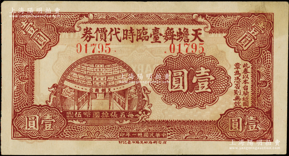 民国卅一年(1942年)天蟾舞台临时代价券壹圆,上印舞台图,发行于孤岛时期,该舞台乃老上海历时最久、最具规模的戏剧演出场所,其前身已由上海滩闻人经润三、黄楚九所创办;罕见且属首度公诸于阳明,八五成新