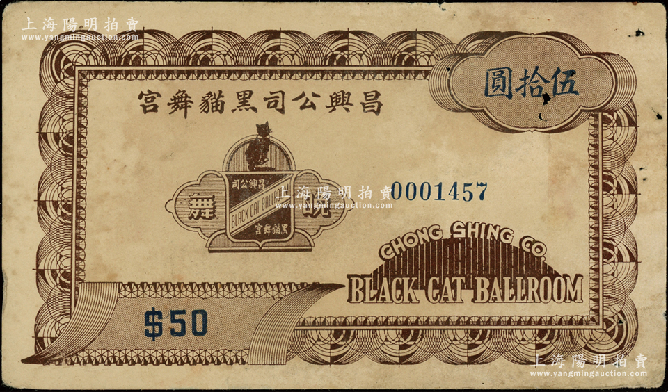 民国(上海)昌兴公司黑猫舞宫伍拾圆,属老上海孤岛时期巴黎饭店内著名舞厅之代价券,少见,七五成新