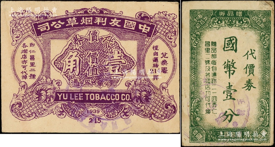 中国友利烟草公司代价券国币壹分、1939年壹角共2枚不同,均背印孔雀、豹子和山水风景图,发行于老上海孤岛时期,形制美观;源于前辈名家之旧藏,其中壹角券罕见且属首度公诸于阳明,七至八成新