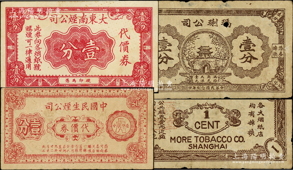 老上海烟草公司代价券3种,详分:大东南烟公司代价券壹分,中国民生烟公司代价券壹分,中国玛琍烟公司1939年壹分,发行于孤岛时期;源于前辈名家之旧藏,七至八成新