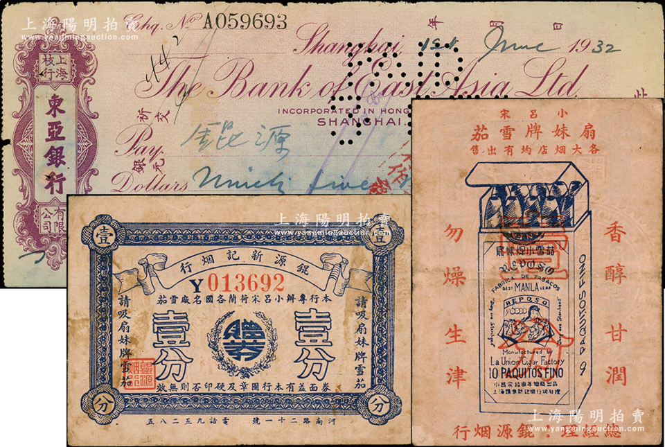 民国(上海河南路)锟源新记烟行赠券壹分,该行专办小吕宋荷兰各国名厂雪茄,背印小吕宋扇妹牌雪茄广告图;另附1932年上海东亚银行银元支票1枚,其收款人和背书均为锟源烟行;源于前辈名家之旧藏,少见,七五至八成新