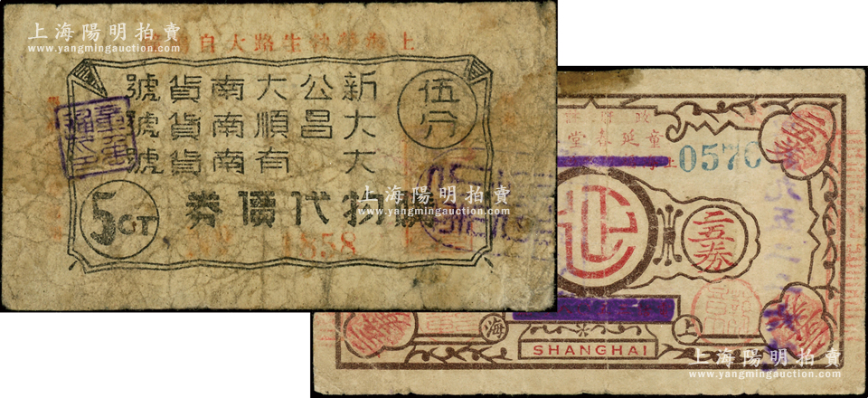 老上海代价券2种,详分:(上洋虞洽卿路)童延春堂药号二五券“暂作壹分”;新公大南货号、大昌顺南货号、大有南货号购物代价券伍分,属三家联合发行;源于著名集钞家吴筹中先生之旧藏,少见,七成新