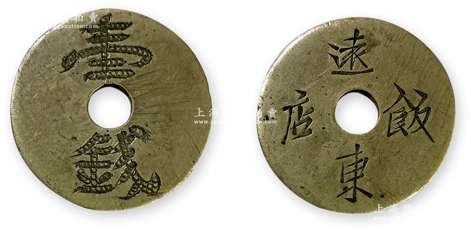 民国早期(上海)“远东饭店壹钱”代用币1个,白铜质,直径21mm,此乃迄今仍存的上海著名“老字号”饭店,位于西藏路北海路口;此代用币未见图片记载,保存甚佳,敬请预览