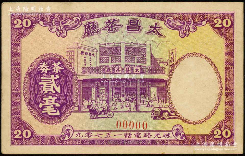 民国时期广州(珠光路)太昌茶厅茶券贰毫票样,上印茶楼图,形制美观,时珠光路为广州著名商业骑楼街,罕见且属首度公诸于阳明,八成新