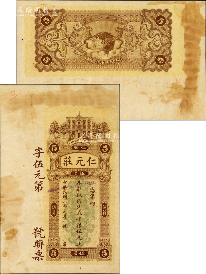 民国三年(1914年)仁元庄·取柒兑直平银伍元,汕头地名,由香港代印,上印洋楼人物图,背印双狮捧地球,属未正式发行之样本券,且目前为之仅见;资深藏家出品,九成新