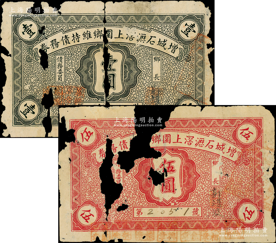 民国廿四年(1935年)增城石沥滘上围乡维持债务券壹圆、伍圆共2枚全套,背印缘由和发行条例;广东民间钞票(今属广州黄埔区)之罕见品,且属首度公诸于阳明,唯惜破损品,敬请预览