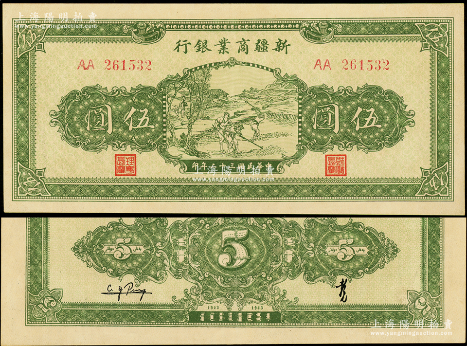 民国三十二年(1943年)新疆商业银行伍圆,背印彭吉元(“新疆王”盛世才妹夫)中英文签名,上佳品相,九至九五成新