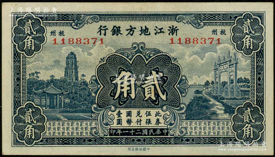 民国二十一年(1932年)浙江地方银行贰角,杭州地名;源于前辈名家之遗藏,上佳品相,九成新