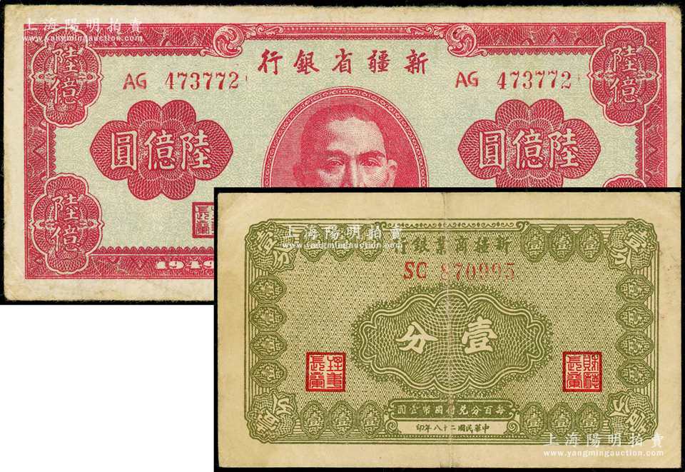 新疆纸币2种,详分:1939年新疆商业银行壹分,1949年新疆省银行陆亿圆,原票七五至八成新