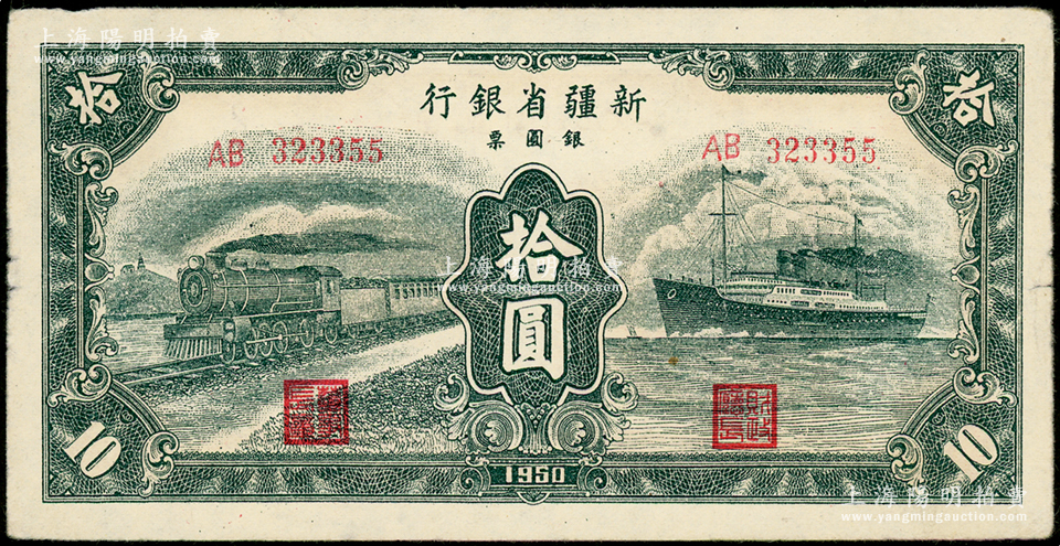 1950年新疆省银行银圆票绿色火车轮船图拾圆,前辈藏家出品,原票八五成新
