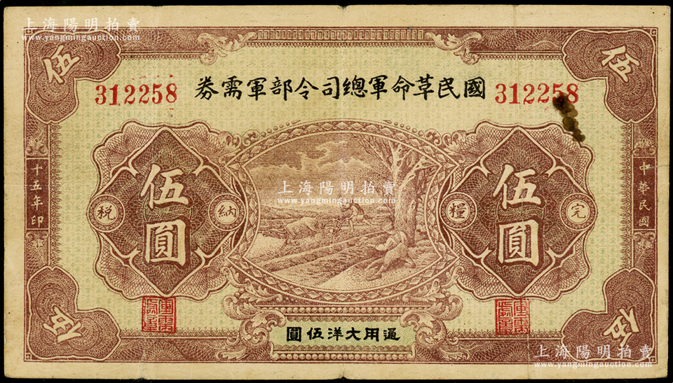 民国十五年(1926年)国民革命军总司令部军需券伍圆,背印国民革命军总司令蒋中正签名之佈告,乃属北伐战争军票,原票七五成新