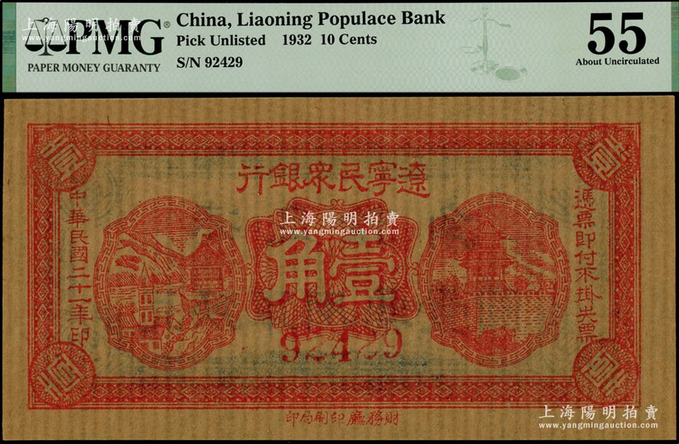 民国二十一年(1932年)辽宁民众银行壹角流通票,5位数号码券,薄纸版(即旧时东北糊窗户之薄纸),背印“兑换军用票”字样,属东北义勇军唐聚五部发行;海外藏家出品,九八成新