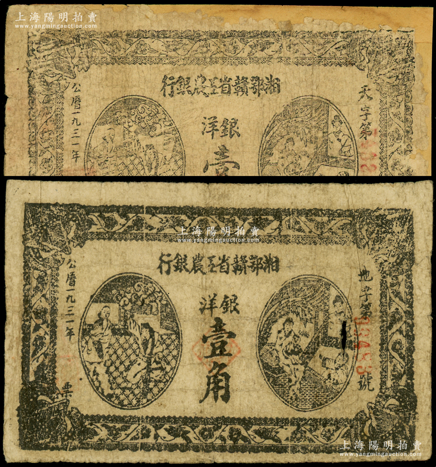1931年湘鄂赣省工农银行银洋壹角共2枚不同,分别为“天”字和“地”字冠字;重庆名家金永先生藏品,其中天字券边有贴补六成新,地字券原票七成新
