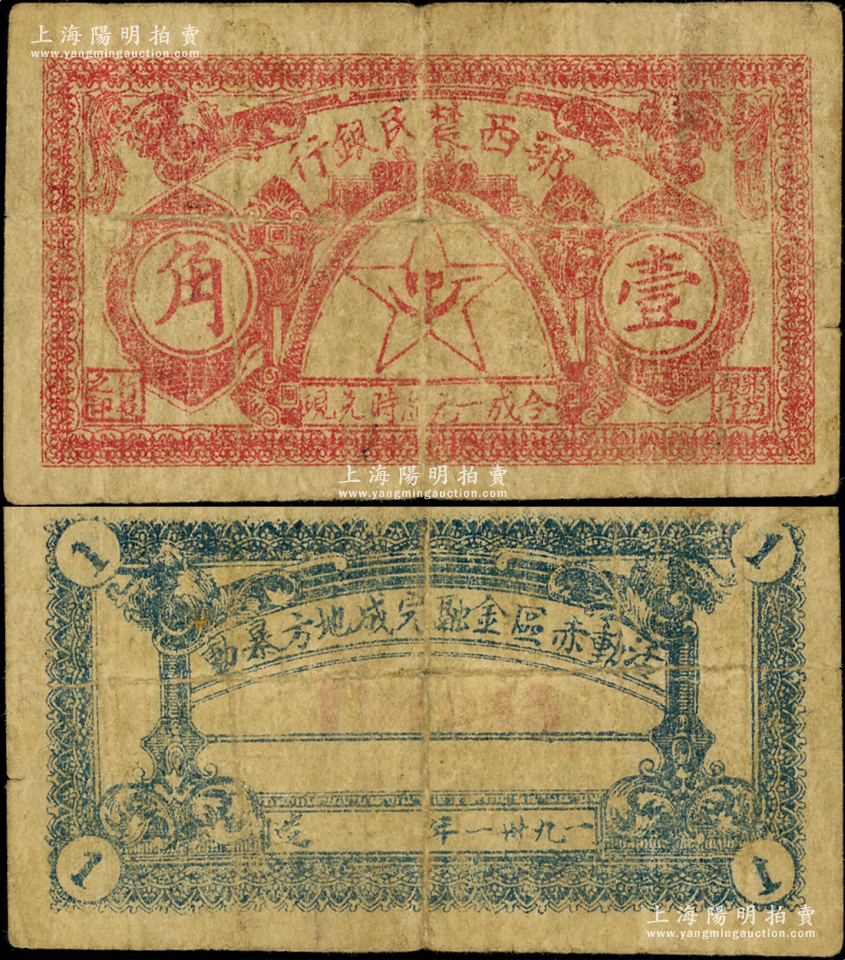 一九卅一年鄂西农民银行壹角,背印“活动赤区金融,完成地方暴动”之口号,属贺龙元帅创建的湘鄂西革命根据地货币;重庆名家金永先生藏品,少见,原票七五成新(江南听雨轩按:此钞背面所印年份有“一九卅一年”和“一九三一年”2种版式,值得藏家注意!)