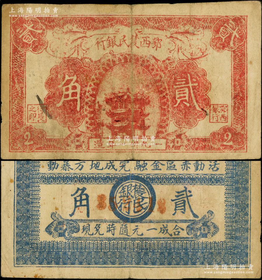 1931年鄂西农民银行红色黄鹤楼图贰角,深色版,背印“活动赤区金融,完成地方暴动”之口号,且背面正中印有圆圈和“农民银行”字样,属贺龙元帅创建的湘鄂西革命根据地货币;重庆名家金永先生藏品,少见,八成新(江南听雨轩按:此种鄂西农民银行贰角券共有2种版式,第1种背面正中印有圆圈和“农民银行”字样,第2种背面正中为空白,钞友理应要加以区分!)