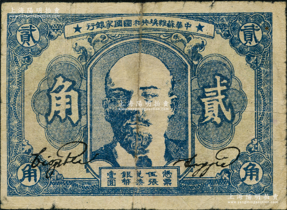 1932年中华苏维埃共和国国家银行列宁像贰角,其号码印在背面下边;重庆名家金永先生藏品,七成新,敬请预览