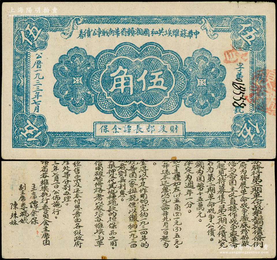 1933年7月中华苏维埃共和国湘赣省革命战争公债券蓝色伍角,由财政部长谭余保署名,属第二期发行,背印条例文字;重庆名家金永先生藏品,罕见,原票八五成新