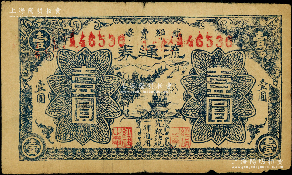 民国二十九年(1940)临郯费峄流通券蓝色轮船图壹圆,属山东抗日根据地货币,由八路军临沂、郯城、费县、峄县四县边联支队所发行,流通于抱犊崮山区一带;重庆名家金永先生藏品,少见,原票七成新