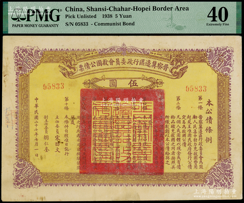 民国二十七年(1938年)晋察冀边区行政委员会救国公债票伍圆,重庆名家金永先生藏品,少见,八成新