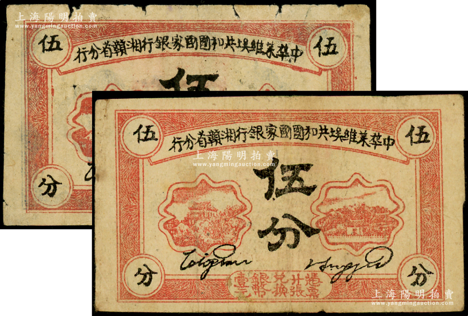 1934年中华苏维埃共和国国家银行湘赣省分行伍分共2枚不同,分别为A字轨和B字轨;海外藏家出品,原票七至八成新