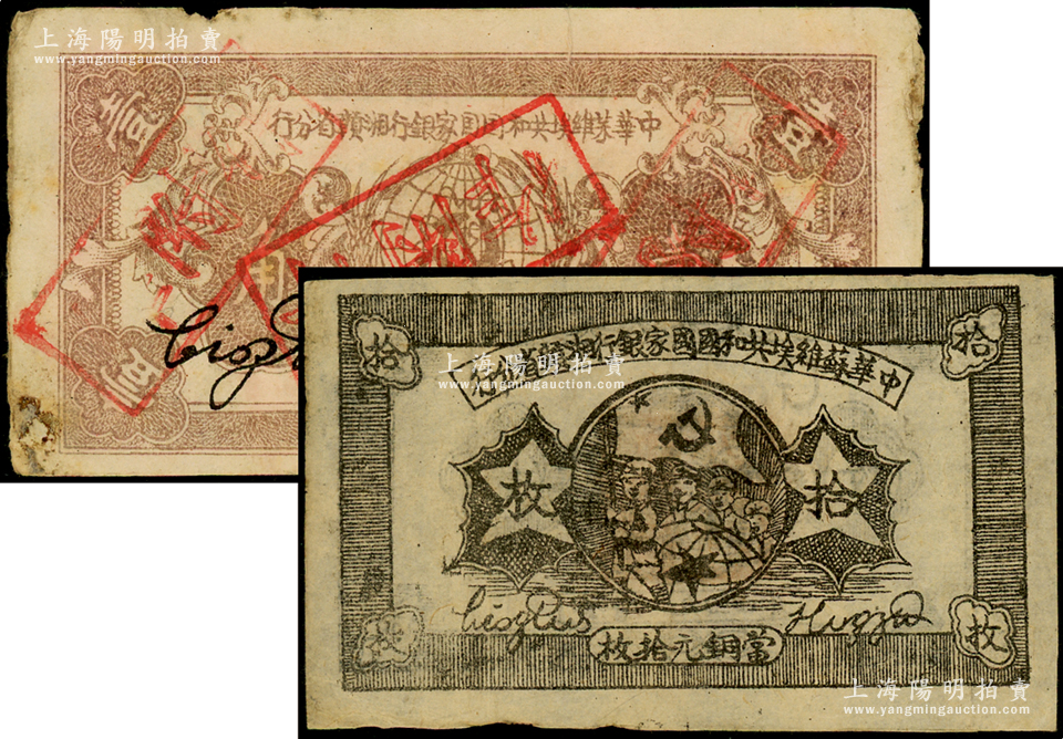 1934年中华苏维埃共和国国家银行湘赣省分行铜元拾枚(G字轨)、壹角(D字轨)共2枚不同,海外藏家出品,七至八成新