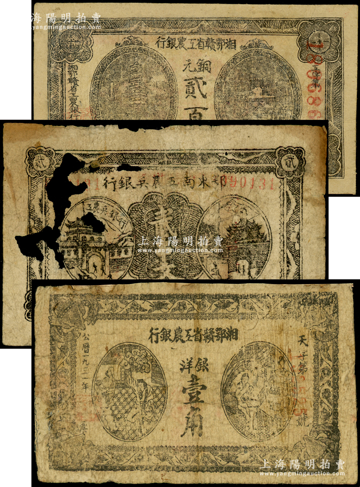 苏维埃纸币3种,详分:1931年鄂东南工农兵银行贰串文,背印苏维埃经济政策,且盖红色大印;湘鄂赣省工农银行(1931年)铜元贰百文、1931年银洋壹角;海外藏家出品,其中1枚有破损、2枚有修补,五至七成新