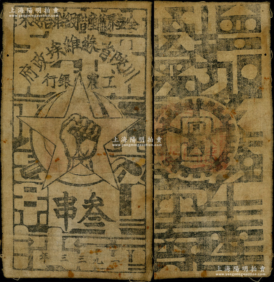 1933年川陕省苏维埃政府工农银行叁串布币,白细布印刷,正面无椭圆形印章版;海外藏家出品,近八成新