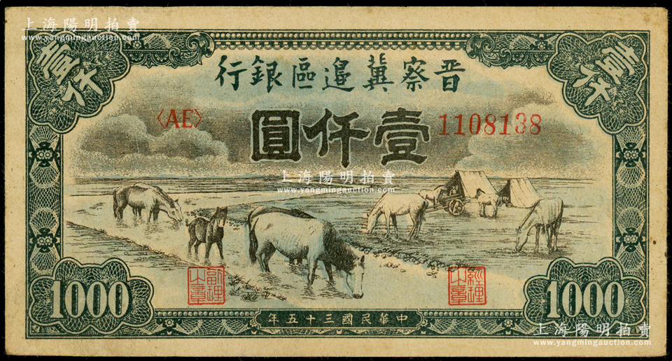 民国三十五年(1946年)晋察冀边区银行“马饮水”壹仟圆,其图案与第一版人民币维文版“马饮水”壹仟圆券较为接近;海外藏家出品,八成新