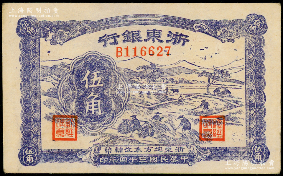 民国三十四年(1945年)浙东银行伍角,新四军抗币,海外藏家出品,九成新