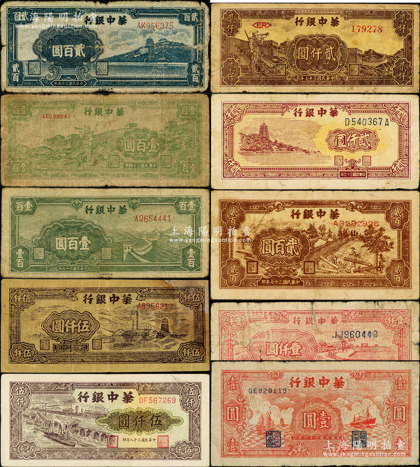 华中银行纸币10种,详分:1945年红色帆船与轮船图壹圆、绿长城壹百圆、长城吹号图壹百圆,1946年蓝万寿山贰百圆,1948年锯木图贰百圆、红风车壹仟圆、六和塔贰仟圆、长城吹号贰仟圆,1949年矿山图伍仟圆、码头图伍仟圆;海外藏家出品,六至八成新,敬请预览