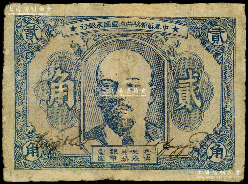 1932年中华苏维埃共和国国家银行列宁像贰角,薄纸版,其号码印在背面下边,有修补,七成新