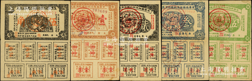 1936年中华苏维埃共和国经济建设公债券伍角、壹圆、贰圆、叁圆、伍圆共5枚全套,由毛泽东、林伯渠等署名发行;资深藏家出品,八至八五成新,敬请预览