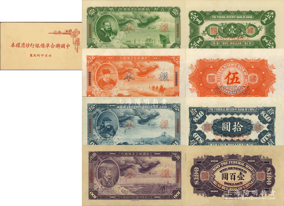 民国二十七年(1938年)中国联合准备银行大龙壹圆、伍圆、拾圆、壹百圆样本券共4种大全套,正背共8枚,属《中国联合准备银行钞票样本》原册之物;此乃该行第一套纸币,印刷精美,久负盛名;源于马定祥先生之旧藏,罕见,九八成新