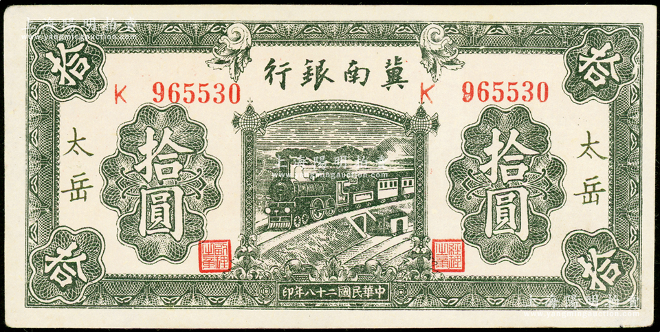 民国二十八年(1939年)冀南银行绿色拾圆,太岳地名,少见,九成新