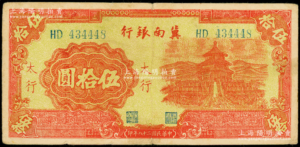 民国二十八年(1939年)冀南银行红色天坛图伍拾圆,太行地名,原票八成新