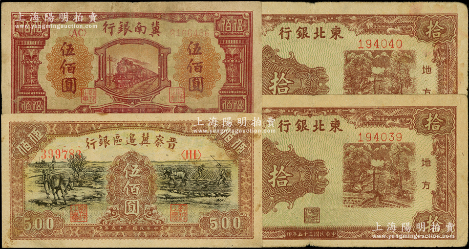 区票4枚,详分:冀南银行1948年红火车图伍佰圆;晋察冀边区银行1946年赶骡与耕地图伍佰圆;东北银行1946年绿底咖啡色打水浇地图拾圆2枚连号;七至八成新