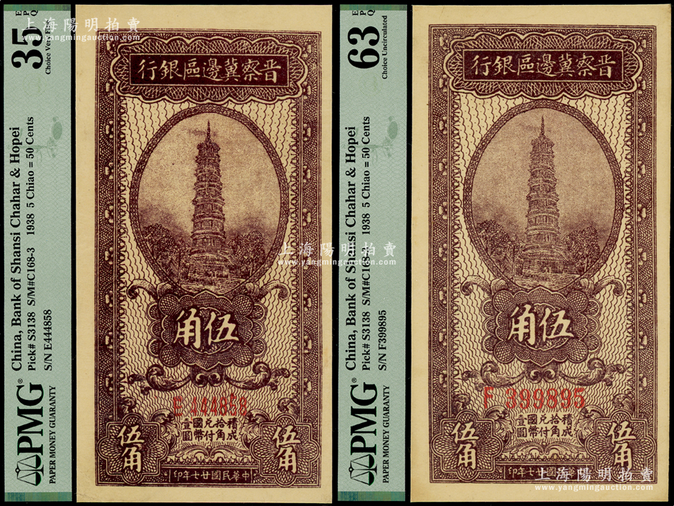 民国廿七年(1938年)晋察冀边区银行伍角共2枚不同,分别为柱体小号码券、圆体大号码券,PMG VF 35 EPQ和UNC 63 EPQ