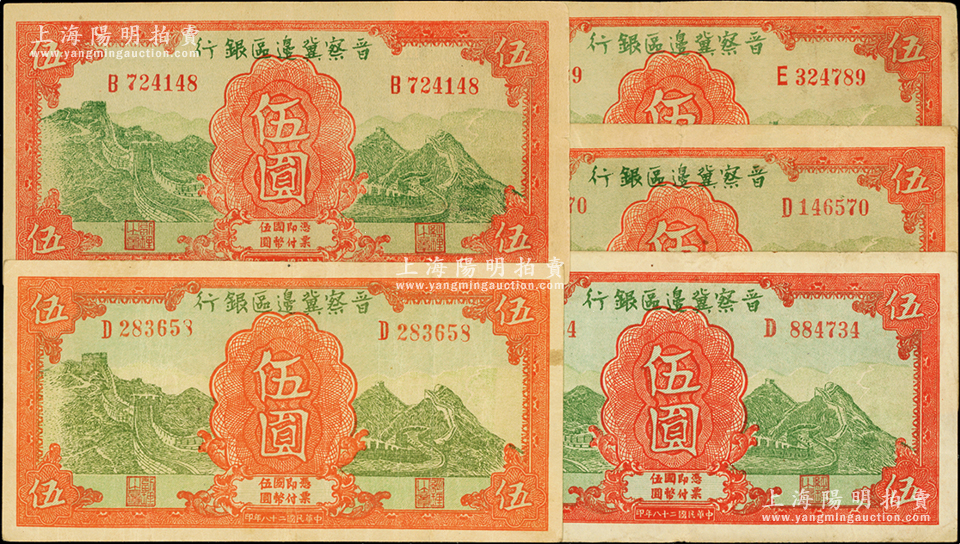 民国二十八年(1939年)晋察冀边区银行长城图伍圆共5枚,原票八成新