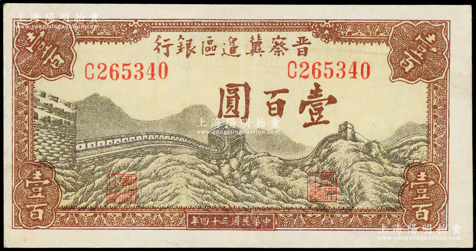 民国三十四年(1945年)晋察冀边区银行长城图壹百圆,资深藏家出品,九成新