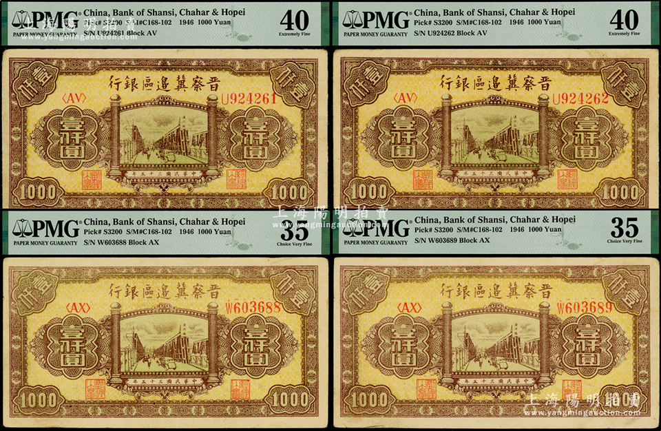 民国三十五年(1946年)晋察冀边区银行清河桥壹仟圆共4枚,内中各2枚连号,PMG 35 VF和40 EF(注:PMG不懂得看品相,欢迎审视实物!)