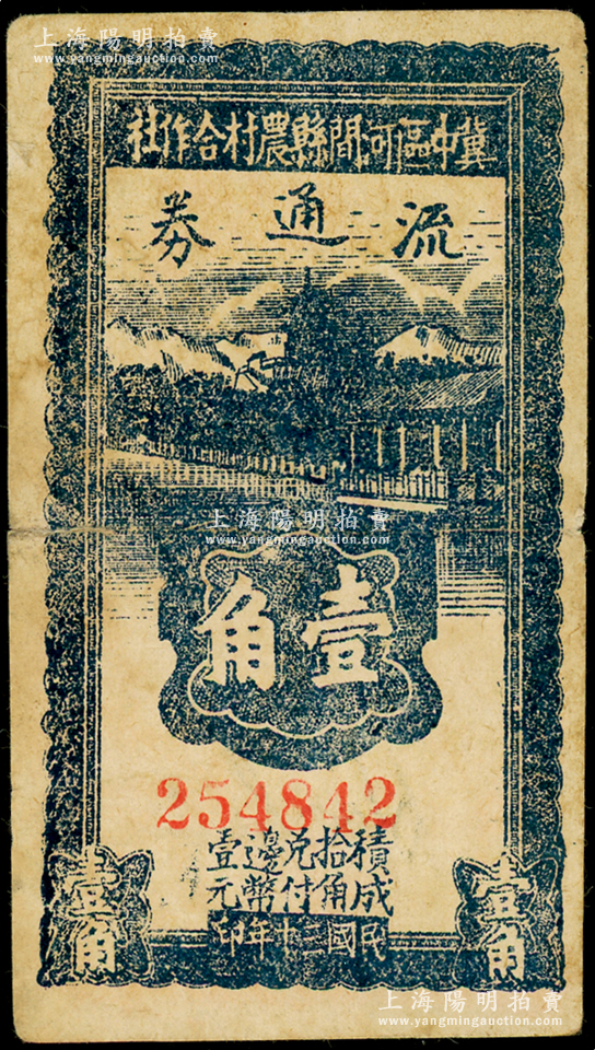 民国三十年(1941年)冀中区河间县农村合作社流通券壹角,资深藏家出品,背面边侧微有小贴痕,七五成新