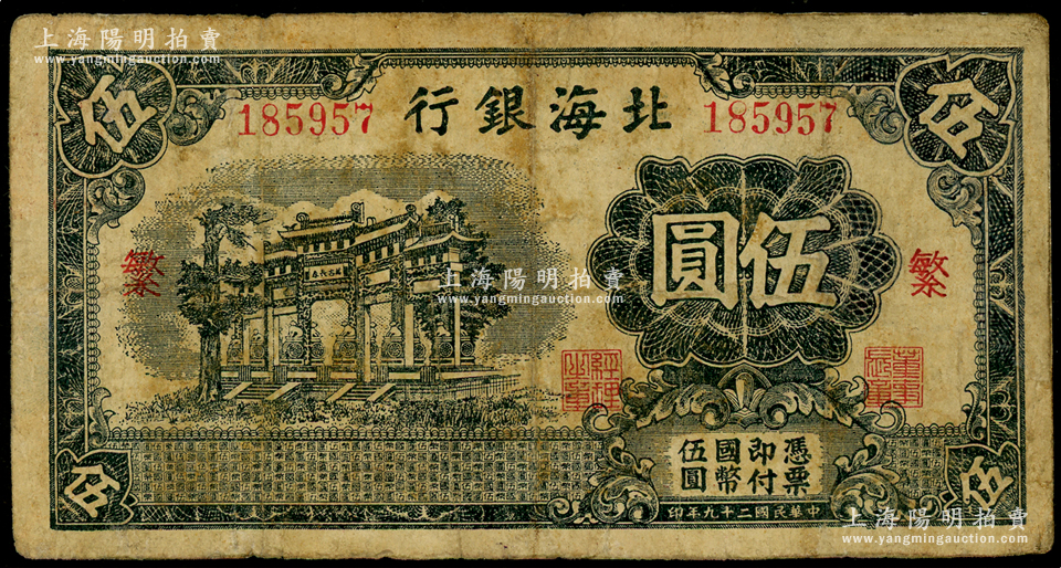 民国二十九年(1940年)北海银行黑色万古长春牌坊图伍圆,无地名,加印红色“繁”字,少见,有修补,七成新
