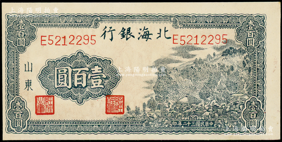 民国三十二年(1943年)北海银行蓝黑色山景图壹百圆,山东地名,单字轨大号码版/背印“保”字,且背印英文口号“New democracy Free China”(即“新民主自由中国”);资深藏家出品,上佳品相,九八成新