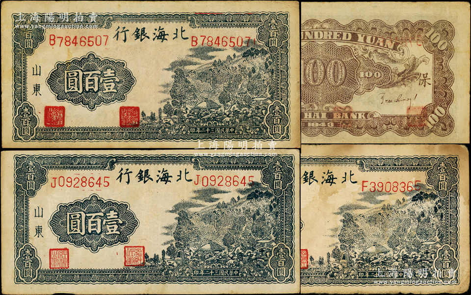 民国三十二年(1943年)北海银行蓝黑色山景图壹百圆共3枚,山东地名,单字轨大号码版/背印“保”字,分别为B、F和J字轨,其中B字轨属手盖职章与通常所见者不同(此版式少见),原票七至八成新